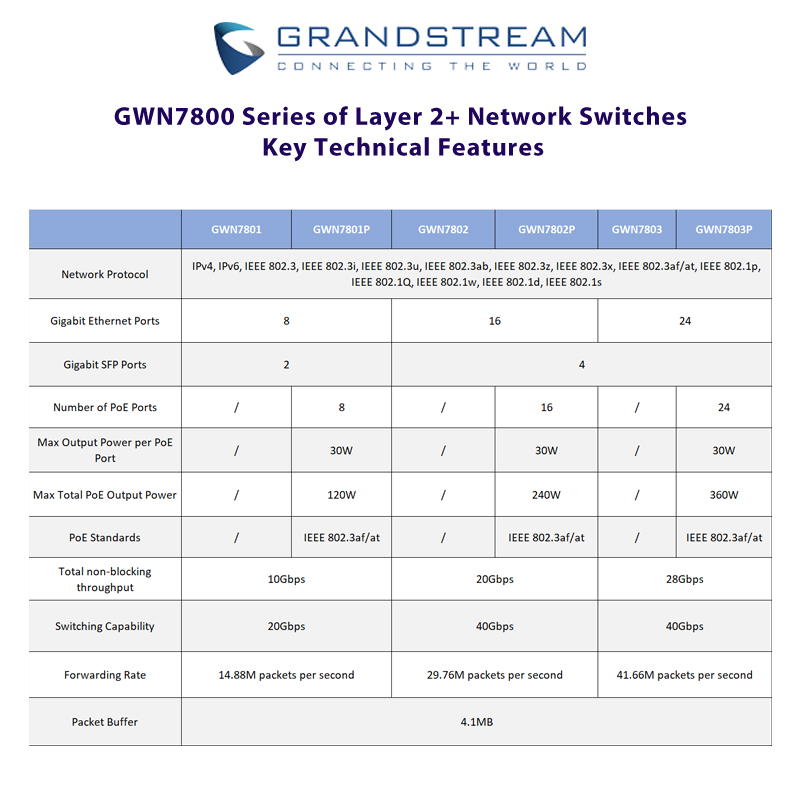 The GWN7800 series are Layer 2+ managed network switches that allow small-to-medium enterprises to build scalable, secure, high performance, and smart business networks that are fully manageable. It supports advanced VLAN for flexible and sophisticated traffic segmentation, advanced QoS for automated detection & prioritization of latency sensitive voice/video traffic, IGMP Snooping for network performance optimization, and comprehensive security capabilities against potential attacks. The PoE models provide smart dynamic PoE output to power IP phones, IP cameras, Wi-Fi access points and other PoE endpoints. The GWN7800 series can be managed in a number of ways, including the local network controller embedded in the GWN7800 series switch, any GWN7000 series router with integrated local master, Grandstream’s free on-premises network management software (GWN Manager), as well as Grandstream’s cloud network management platform (GWN.Cloud). The GWN7800 series are best value enterprise grade managed network switches for small-to-medium businesses. 3-Year Warranty Guaranteed.
